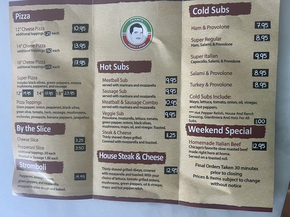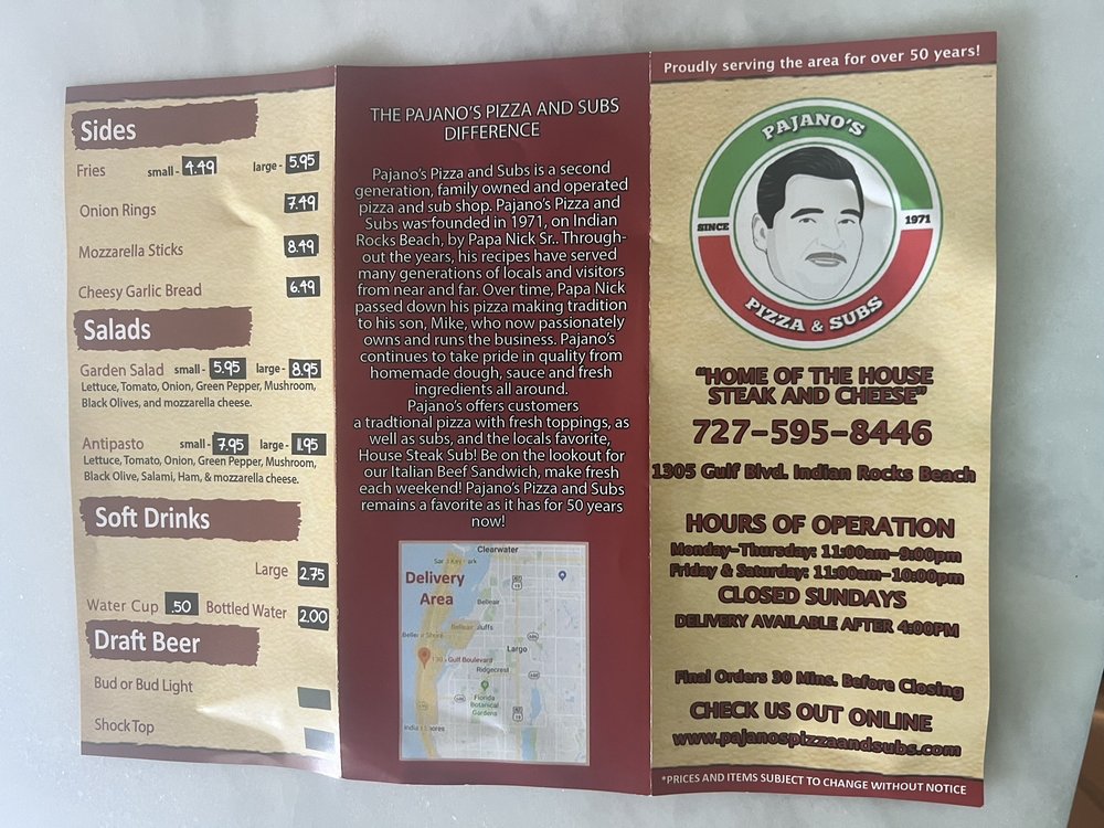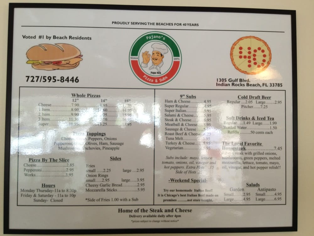 Welcome to Pajano's Pizza and Subs, where quality ingredients and exceptional service meet to create a memorable dining experience. Located in Indian Rocks Beach, FL, this restaurant offers a diverse menu of delicious pizzas and sandwiches, with options for vegans and vegetarians. Customers rave about the perfectly proportioned pizzas, piping hot and flavorful, showcasing the dedication to top-notch ingredients. The friendly staff and efficient service make ordering and dining a breeze, whether you're dining in or taking out. The clean and organized establishment exudes a welcoming atmosphere, perfect for families, groups, or a quiet meal alone. From the aromatic Italian flavors to the fresh salads and diverse menu selection, Pajano's is a must-visit for those seeking a satisfying meal in the area. Stop by and indulge in the goodness that Pajano's Pizza and Subs has to offer.